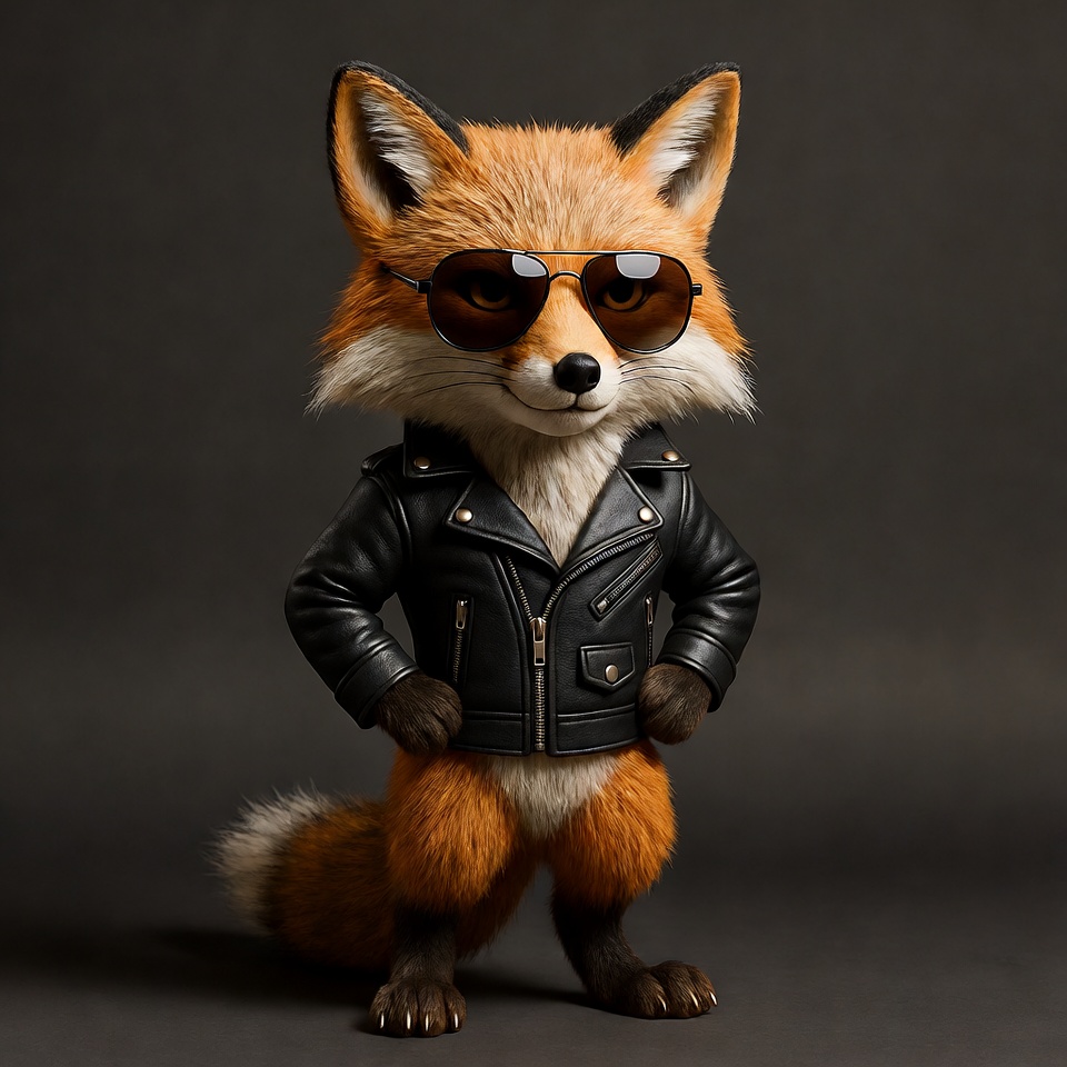 A fox stands upright, wearing a black leather jacket and sunglasses. It strikes a confident pose against a dark background.