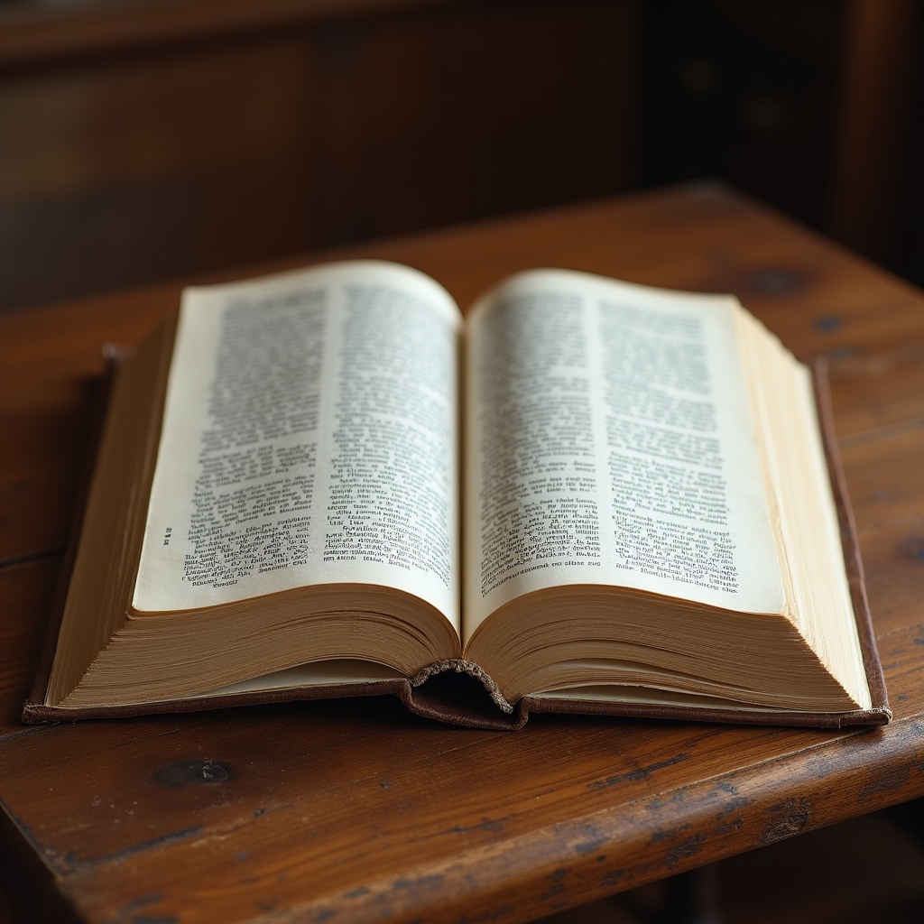 A book lays open on a wooden table showing its pages. The text is arranged in a standard format. The lighting creates a simple scene.