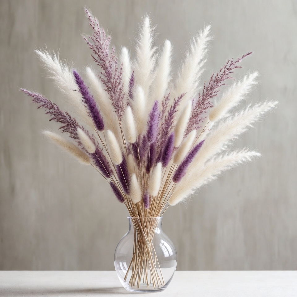 A vase holds a mix of pampas grass in white and purple. The arrangement is placed on a table with a simple background.