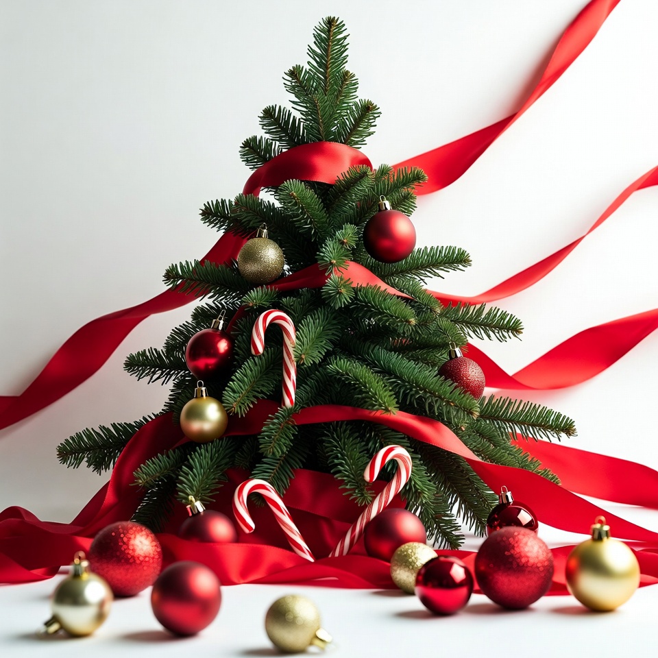 A Christmas tree stands on a white background, decorated with red ribbons, shiny ornaments, and candy canes. Red and gold balls lay around.