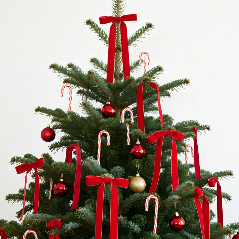 candy canes, celebration, christmas tree, decorations, family, festive, gathering, greenery, holiday, indoor, joy, lights, merry, ornaments, red bows, ribbon, seasonal, shiny ornaments, traditional, winter