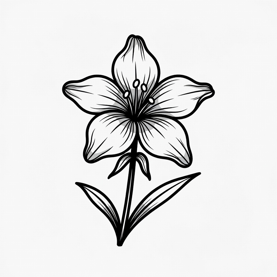 A detailed drawing of a flower shows its petals and leaves. The lines are clear and the design is minimal, focusing on the flower's shape.