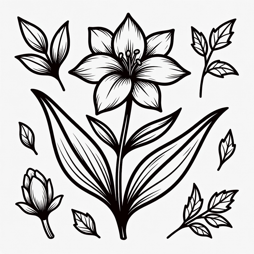 Black line drawing of a flower and various leaves shows details of nature. The designs include buds and stems for artistic purposes.