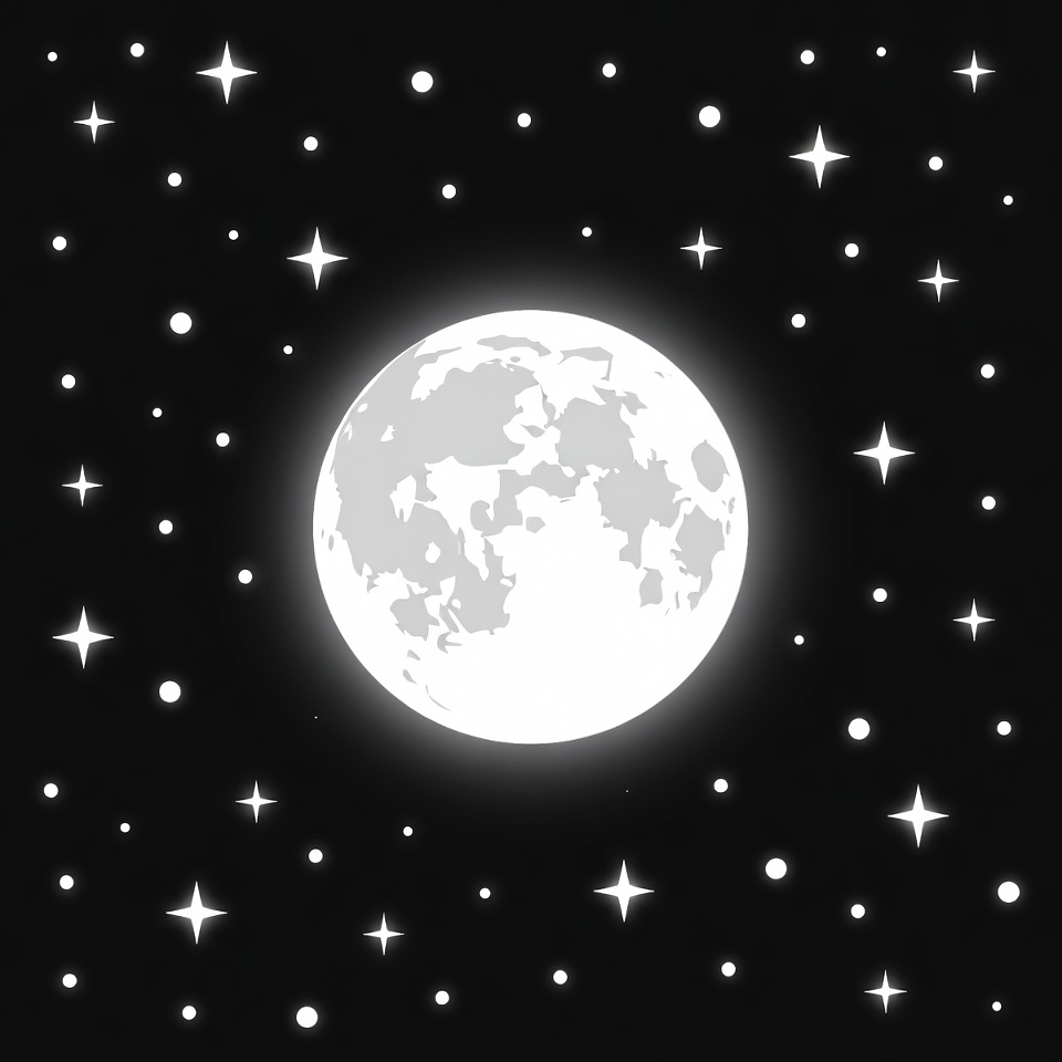 A full moon shines brightly in a dark night sky filled with stars. It is late evening, creating a clear view of the scene.