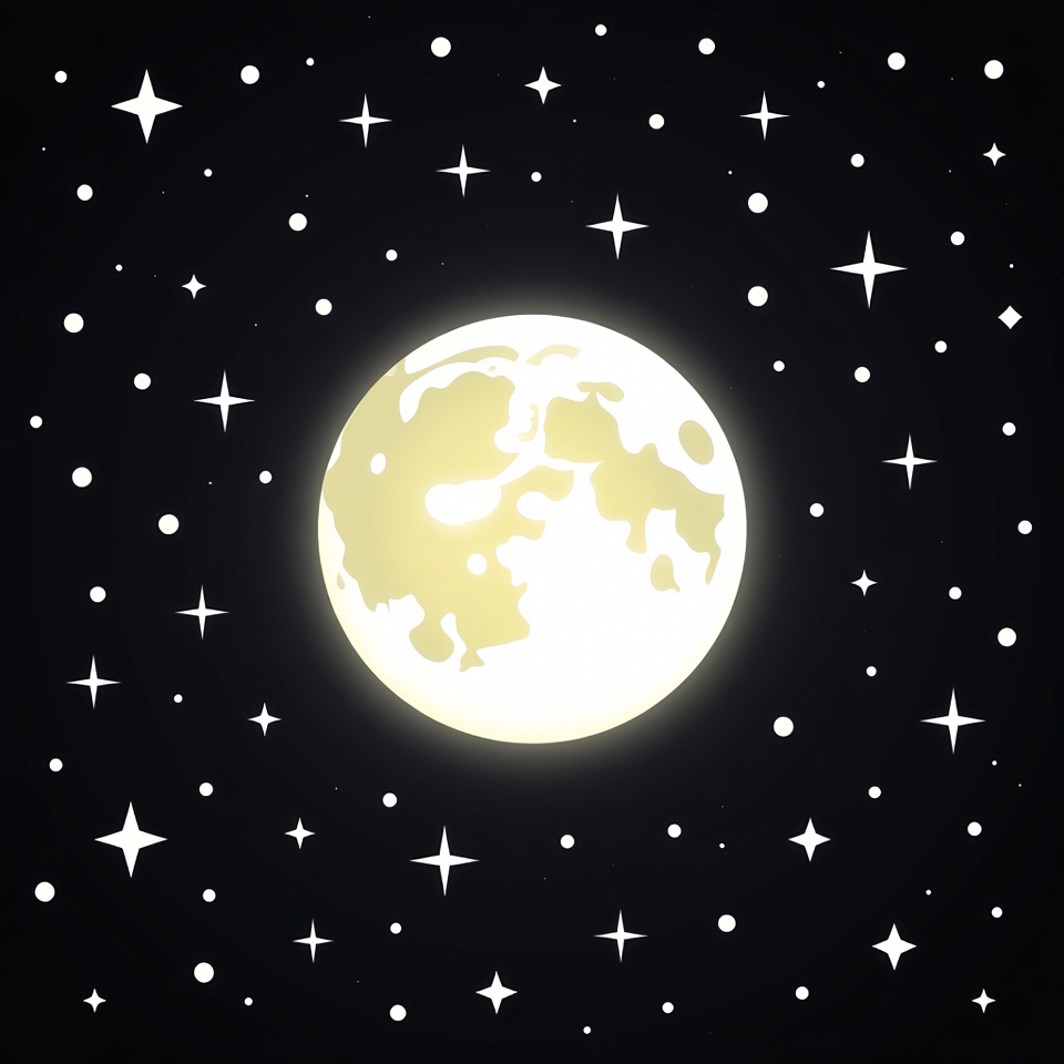 A bright full moon shines in a starry night sky with many stars visible around it. The scene shows a peaceful cosmic view.
