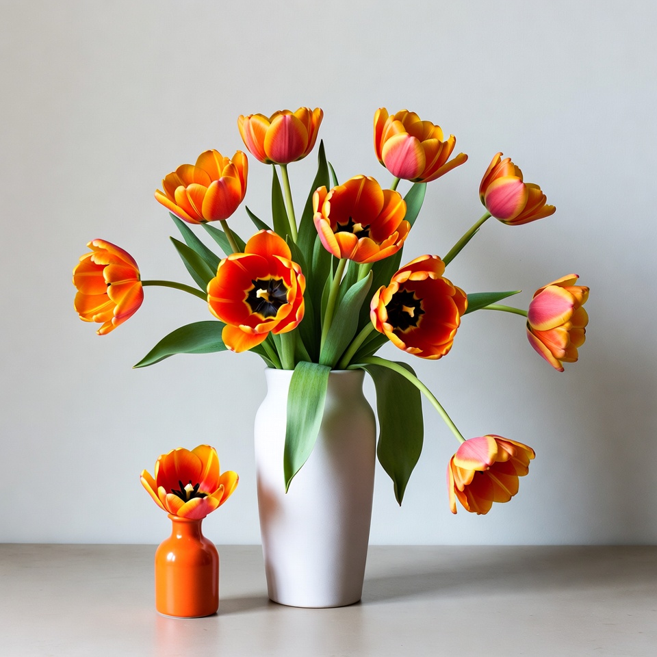 arrangement, beauty, botanical, bright, colors, decoration, design, florals, flowers, home, indoor, leaves, natural, orange, petals, plants, spring, table, tulips, vases