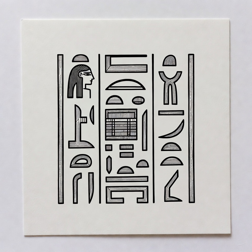 Patterns and symbols from ancient writing. It features hieroglyphs and decorative lines. The art is black on a white background.