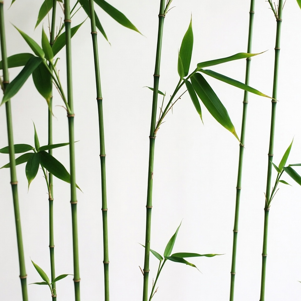 Bamboo stalks with green leaves stand upright against a plain background, showcasing their height and natural growth pattern.