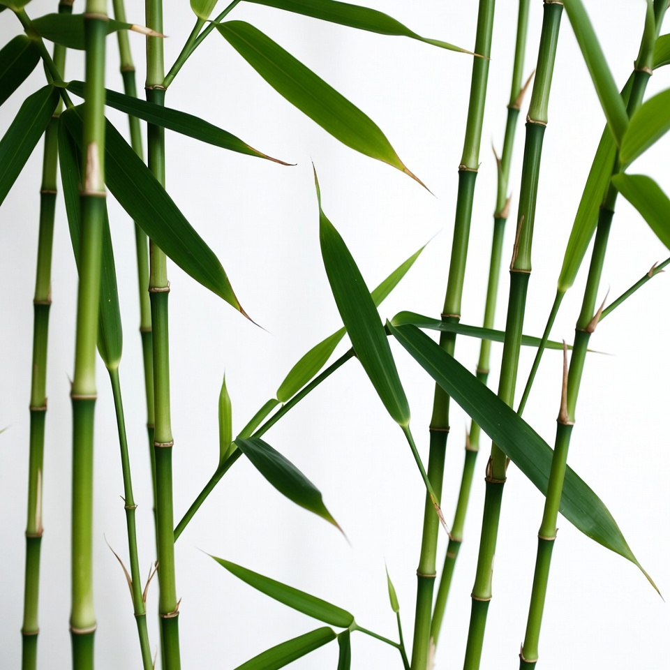 Bamboo stalks and leaves are arranged closely together in natural light. The greenery stands against a plain background, highlighting the plants.