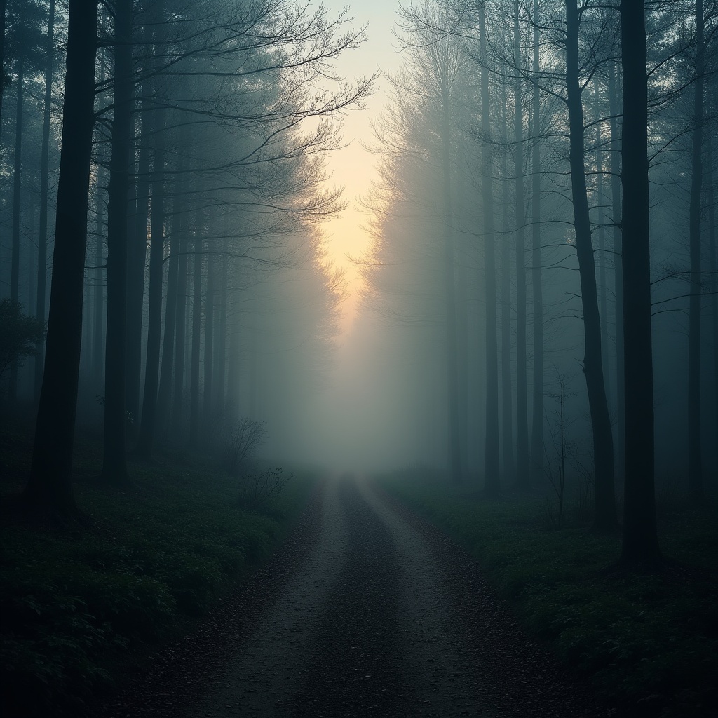 A dirt path runs through a foggy forest at dawn. The trees stand tall and reveal a glowing light in the distance.