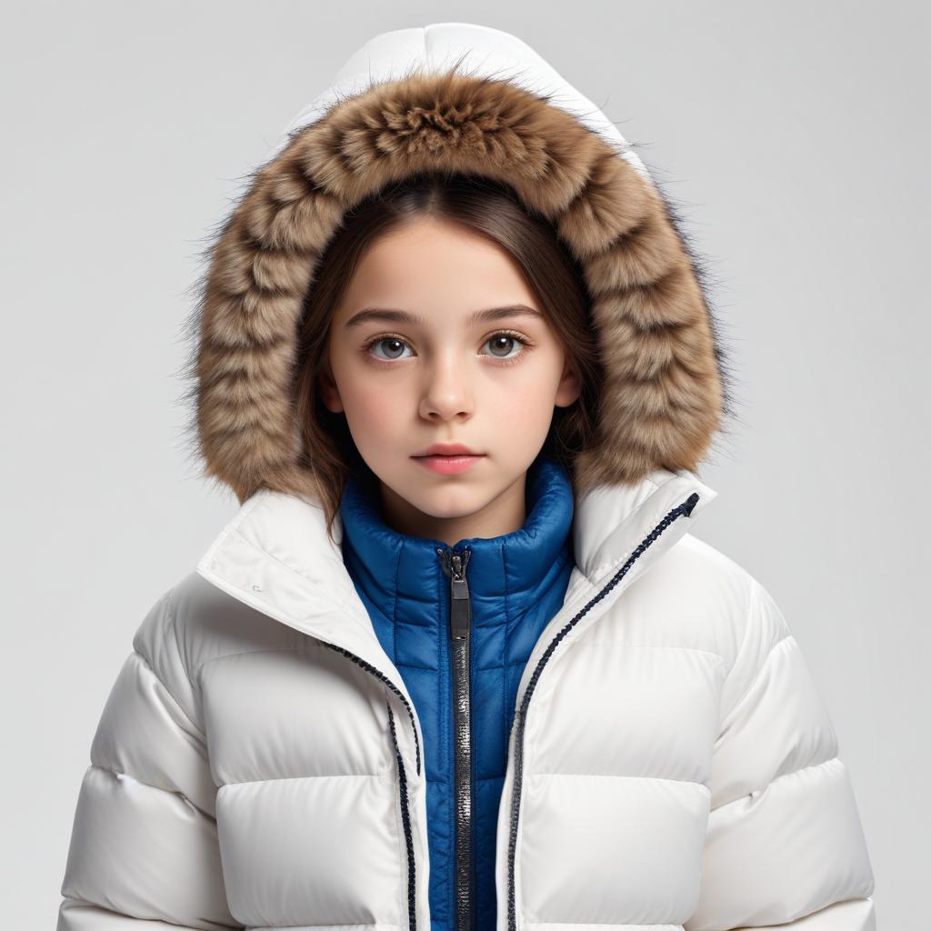 A child stands straight wearing a white winter coat with a fur hood and blue inner jacket. The background is neutral and simple.