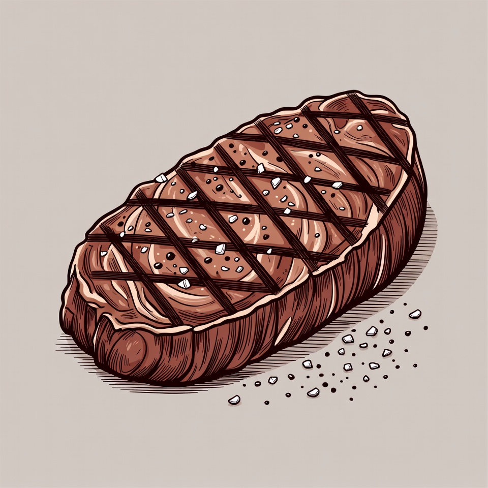 A piece of grilled steak sits on a light background. It features grill marks and some salt on top, presenting a simple food item.