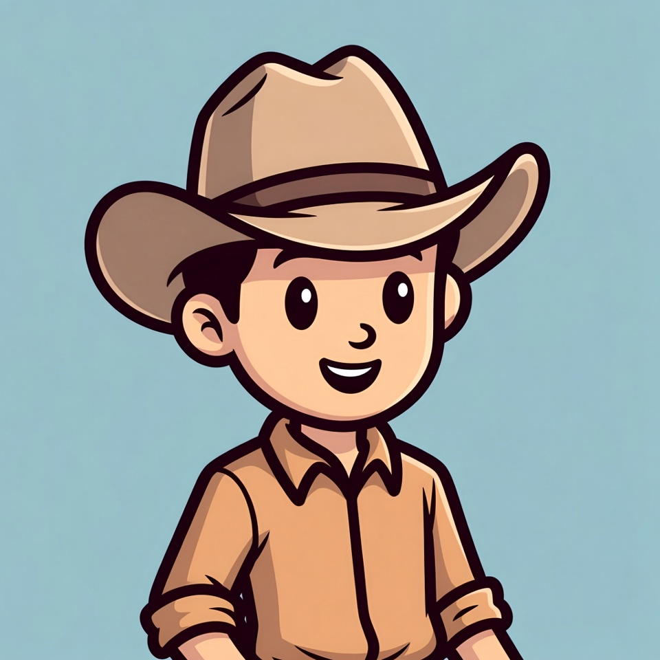 accessory, boy, brown, cartoon, character, cowboy, culture, cute, digital art, graphic, happy, hat, illustration, playful, shirt, smile, style, western, young, youth