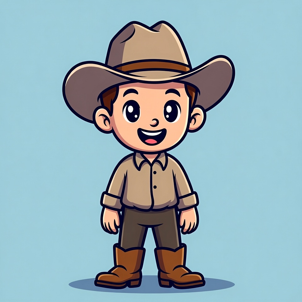 A young boy wears a cowboy hat and boots, standing with a smile. He is dressed in a light shirt and is ready for an adventure outdoors.