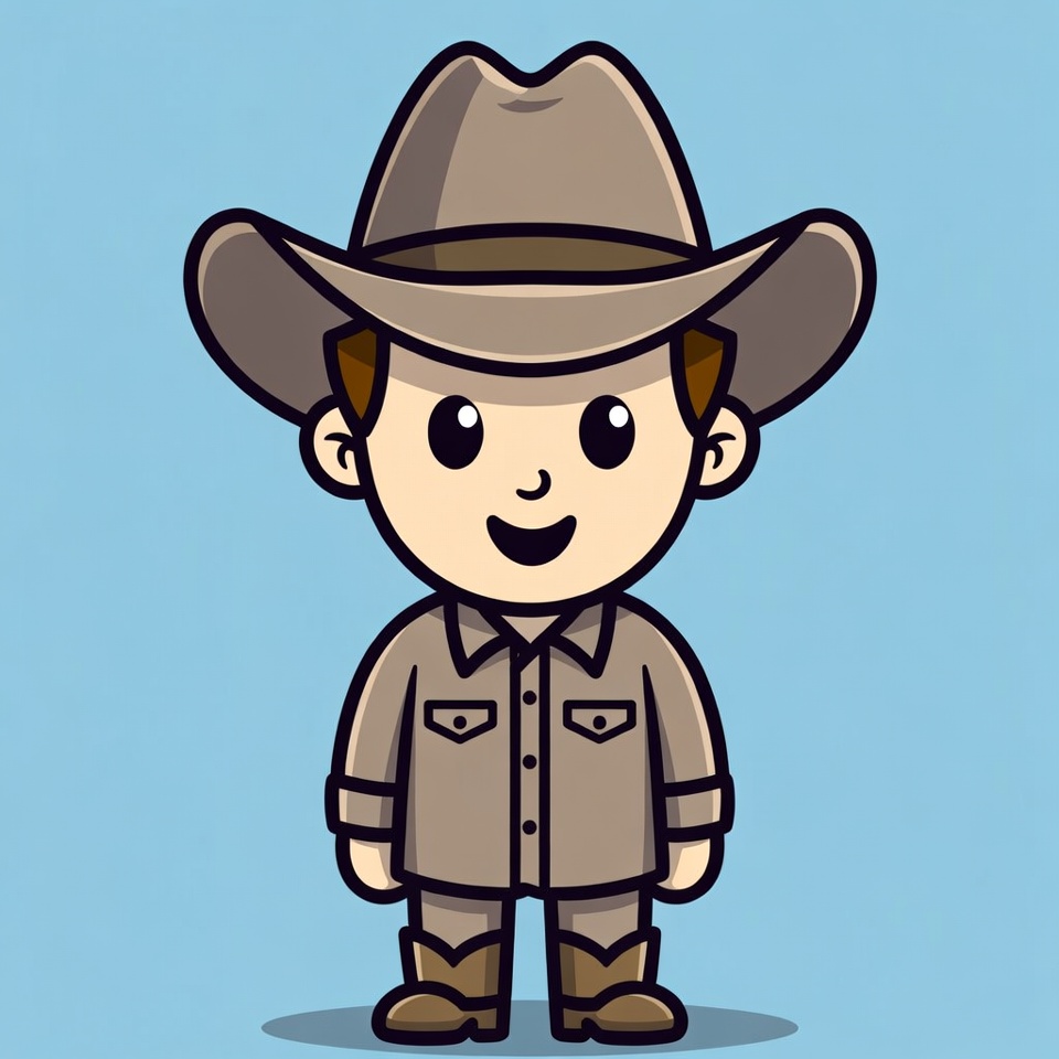 A cartoon character stands smiling, wearing a cowboy hat and outfit. The character is set against a plain light blue background.