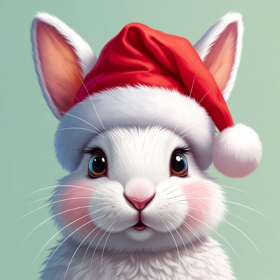 A rabbit with big eyes wears a red Santa hat. It looks cheerful and ready for a holiday celebration. The background is light and simple.
