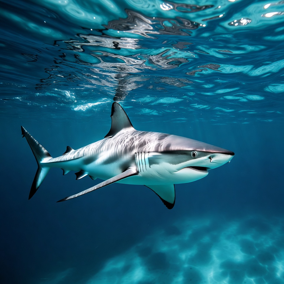 A shark glides through the water, showcasing its features. Light reflects on the surface above, creating a striking view.