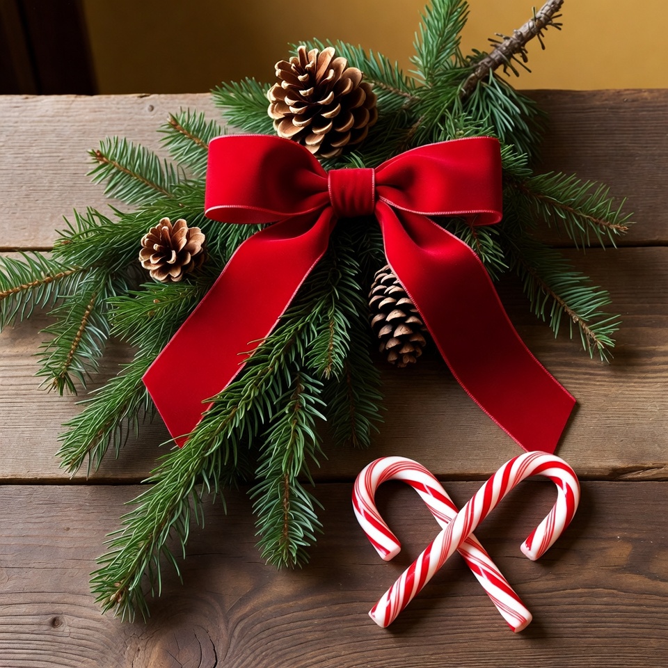 A red bow decorates green pine leaves with pine cones. Two candy canes rest on a wooden surface during the holiday season.