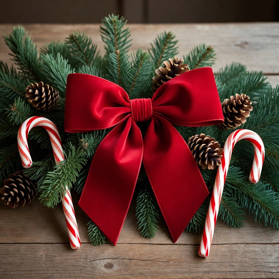 A red bow sits on green pine branches with pine cones and candy canes arranged on a wooden table during the holiday season.