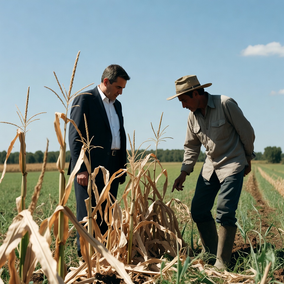 A person discusses issues with a farmer in a cornfield, looking at dry corn plants and crops under clear skies.