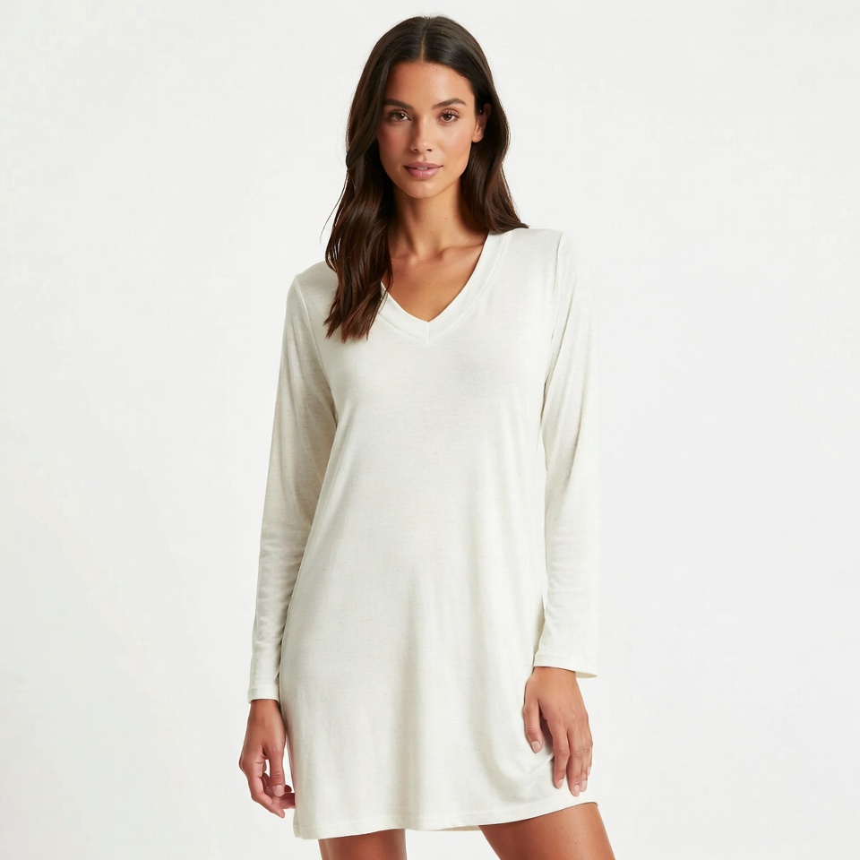 A woman stands confidently, wearing a simple light dress. She has long hair and is positioned in a well-lit indoor area.