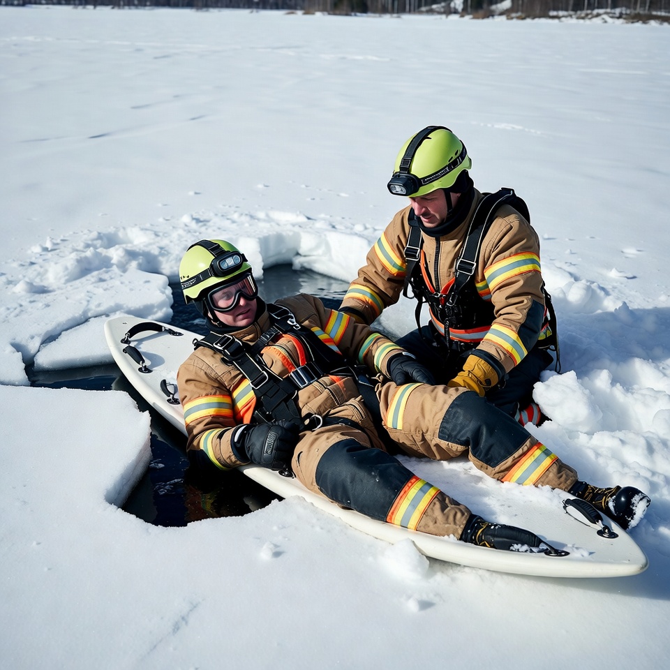 board, cold, emergency responders, equipment, firemen, flotation, frozen lake, help, ice, ice hole, outdoor, rescue, rescue operation, response, safety, survival, teamwork, training, water, winter