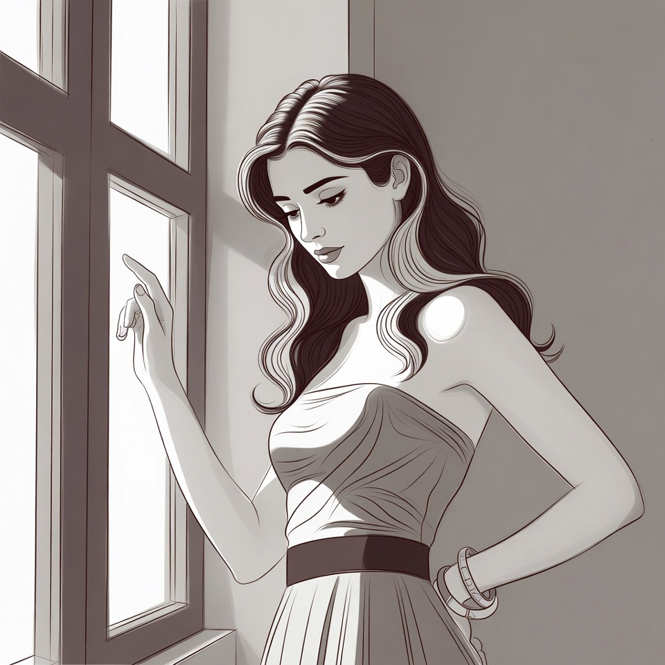 A woman stands by a window in a simple dress. She looks thoughtful while touching the glass with one finger. Sunlight fills the room.