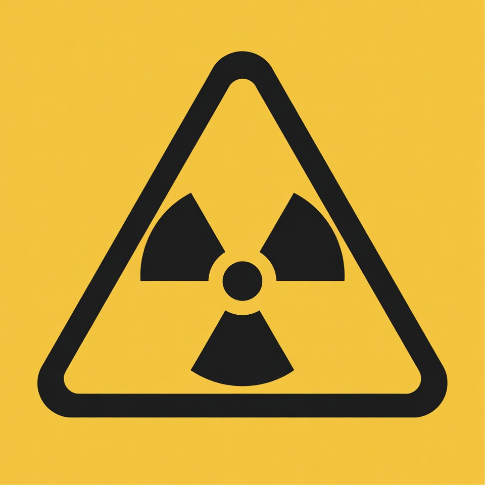 A yellow warning sign with a black radiation symbol. The sign indicates the presence of hazardous radioactive materials in the area.