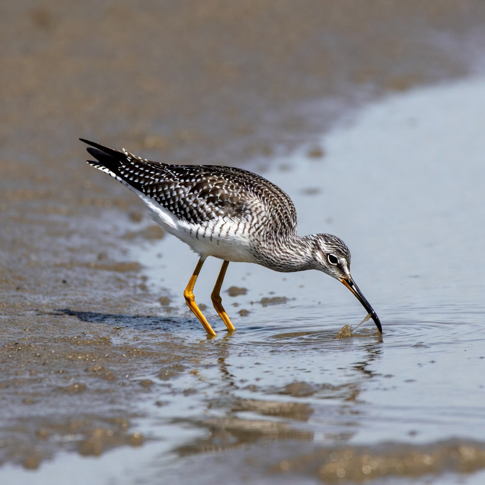 Shorebird foraging along the water