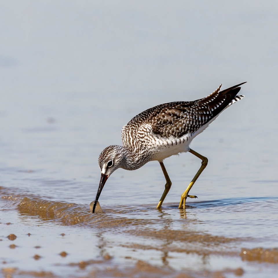 A bird searches for food along the water's edge during the day. It is focused on catching a small creature in the sand.