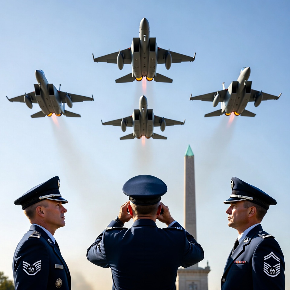 Three military personnel watch as jets perform a flyover during a ceremony near a monument in the afternoon sky.