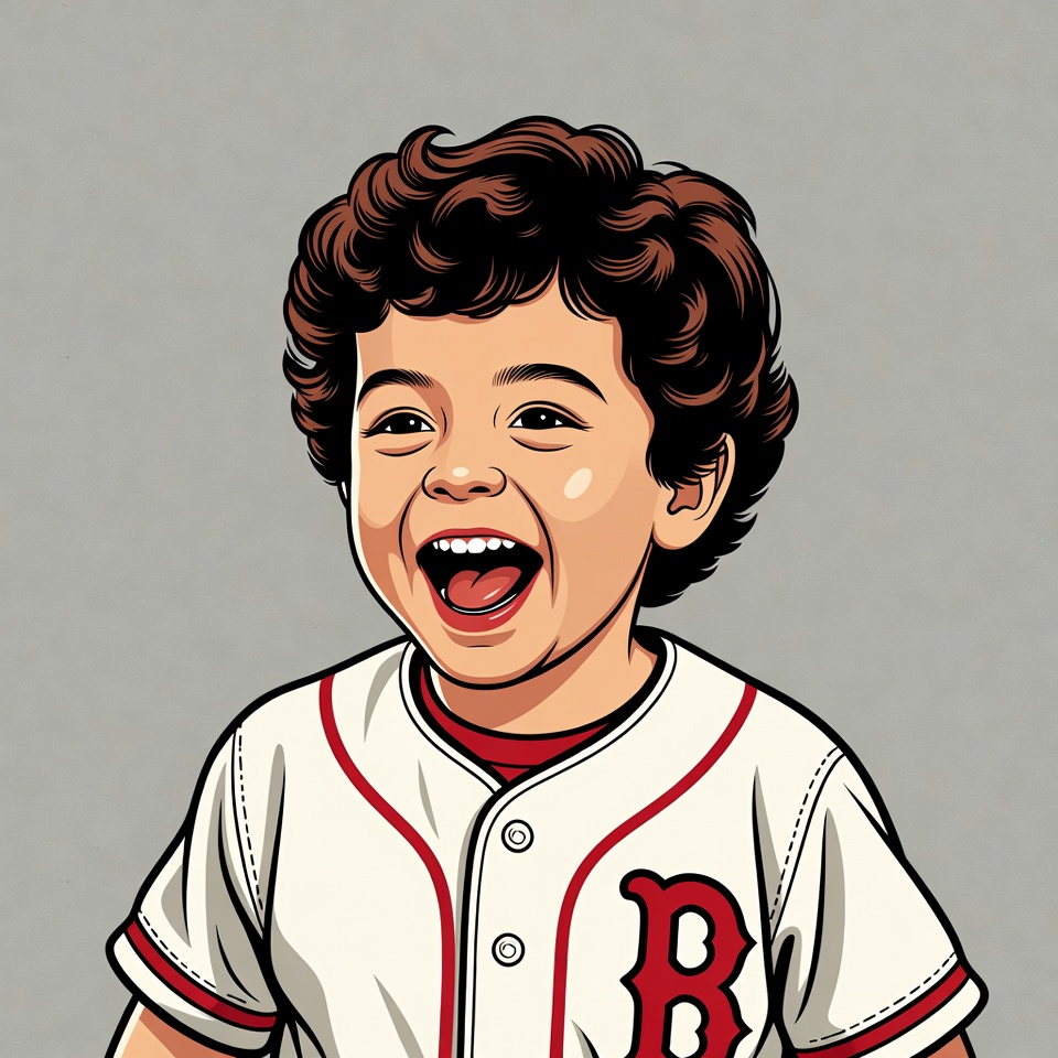A young child laughs while wearing a baseball shirt. The background is plain, highlighting the child's joyful expression.