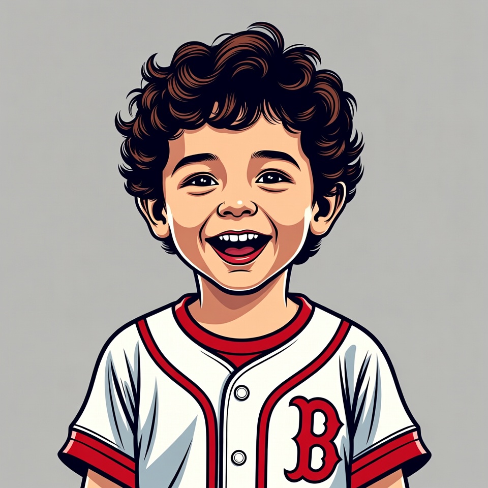 A young boy with curly hair is smiling while wearing a baseball shirt. He appears happy and joyful in a plain background.