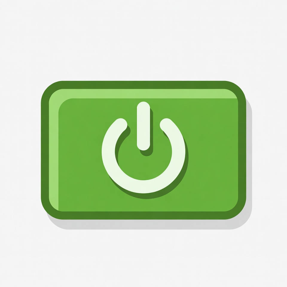 A simple green button with a power symbol sits on a white background. It signifies power on and off actions clearly.