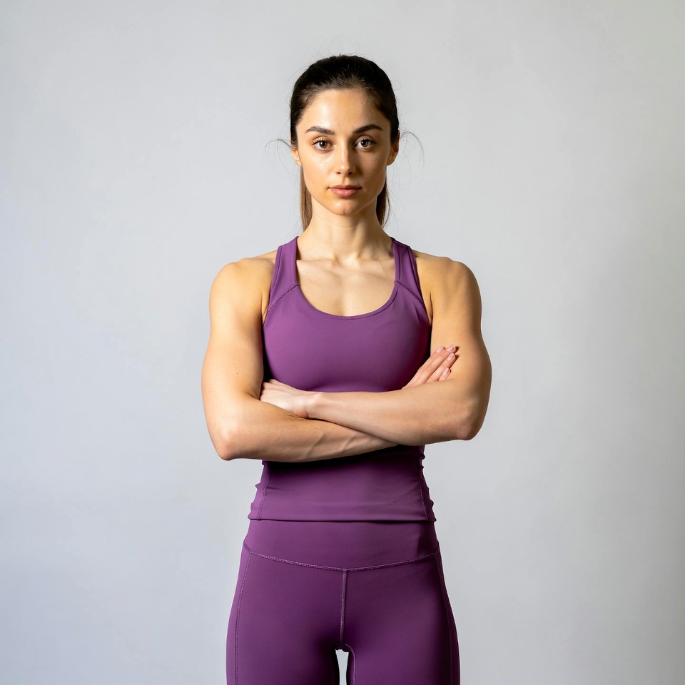 A woman stands with her arms crossed in a studio setting. She appears focused and ready for a workout session.