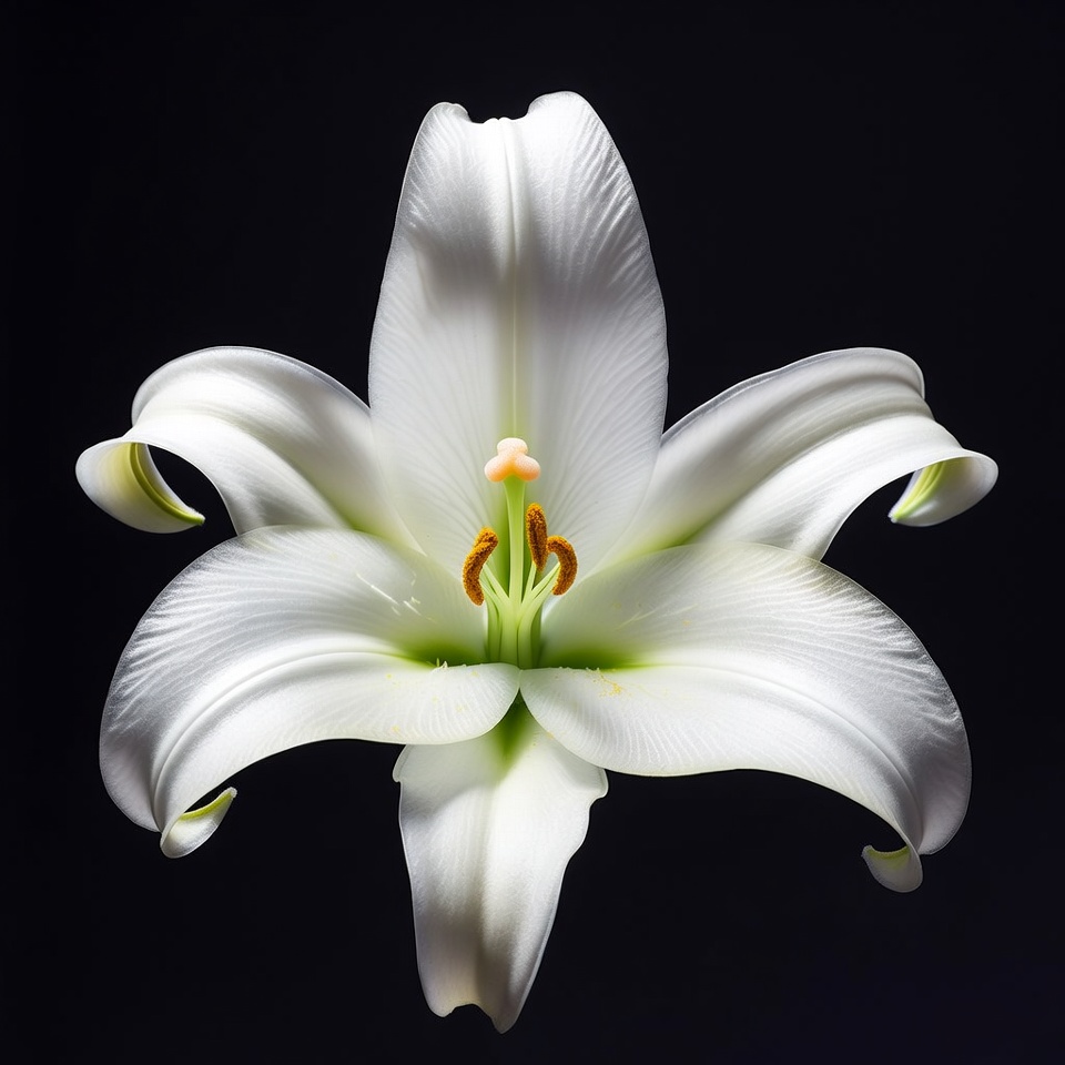 A white lily stands out against a black background, showcasing its petals and pollen. The flower is in full bloom, emphasizing its details.