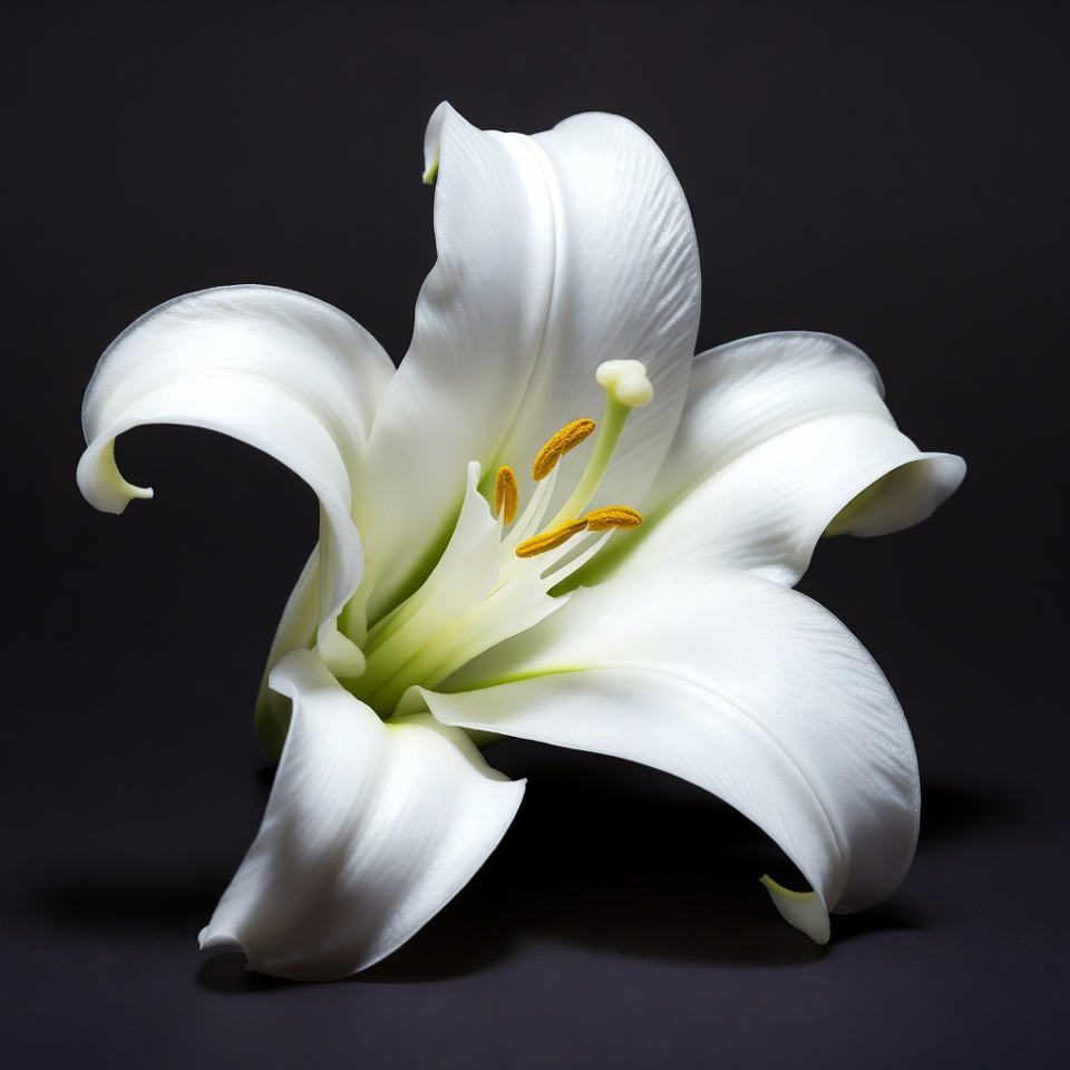 A white lily displays its petals and pollen on a dark surface, highlighting its shape and features.