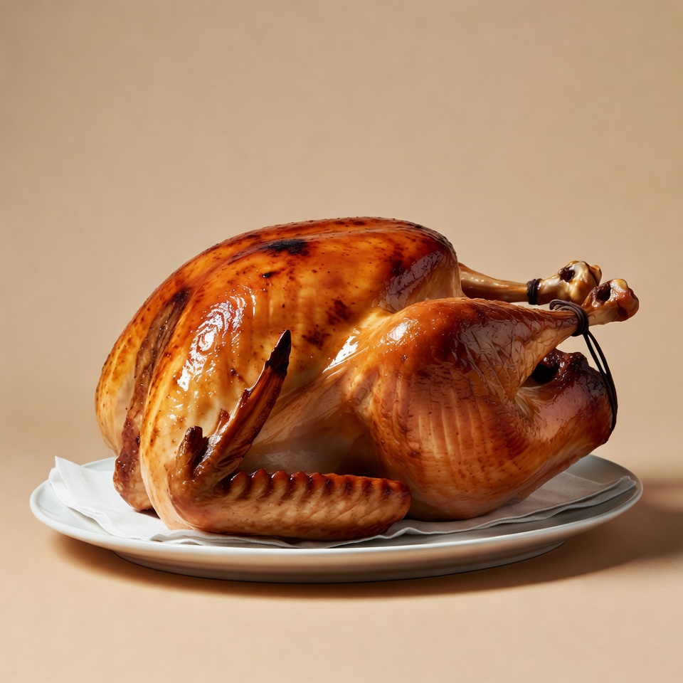 A whole turkey sits on a white plate, freshly cooked and ready for a meal. It is placed against a simple background, making it a focus.