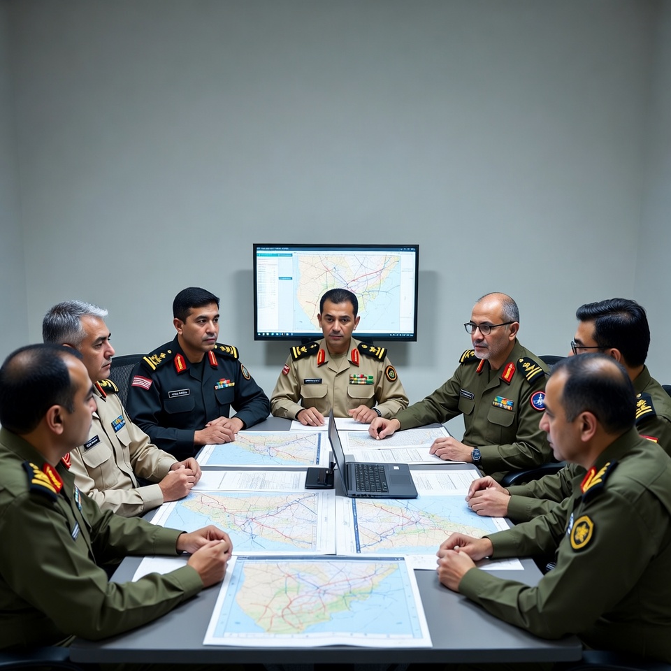 Seven military officers gather around a table with maps and a laptop in a command center for a strategic discussion and planning session.