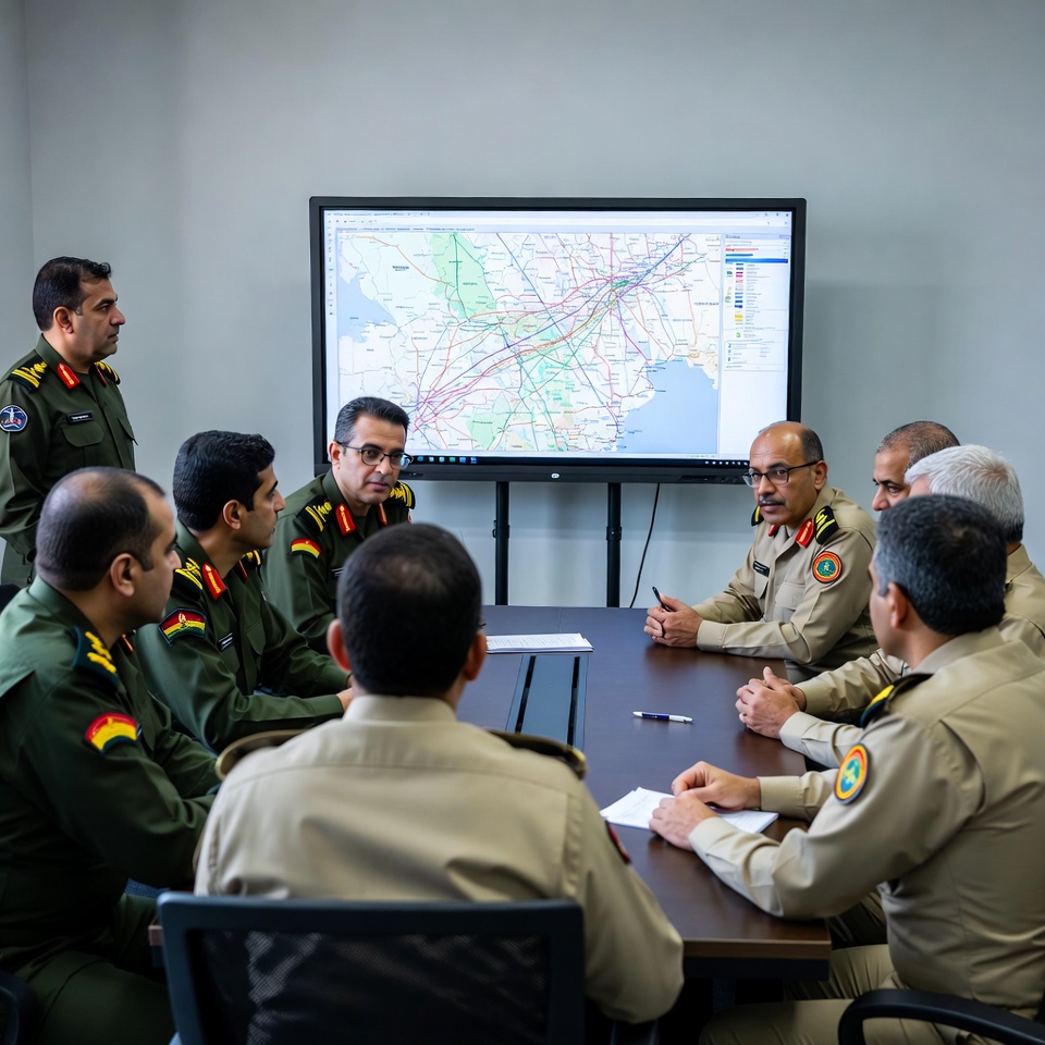 Military officers discuss strategy in meeting room