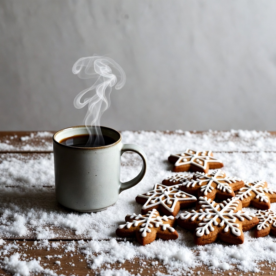 cinnamon, coffee, cookies, cozy, decoration, dessert, festive, food, gingerbread, holiday, mug, snack, snow, steam, sweet, table, warmth, white, winter, wooden