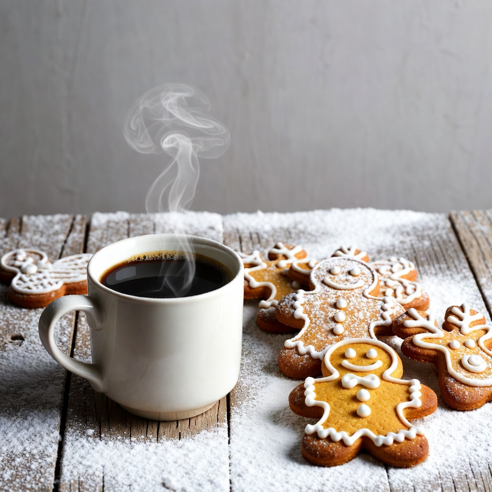 aroma, breakfast, cinnamon, coffee, cookies, cozy, cup, dessert, festive, gingerbread, holiday, homemade, hot drink, snack, snow, steam, sugar, sweets, winter, wooden table