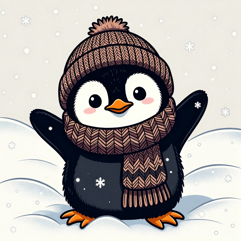 animal, cartoon, character, chilly, cold, cute, festive, fun, happy, hat, illustration, nature, penguin, playful, scarf, snow, snowy, waving, wildlife, winter