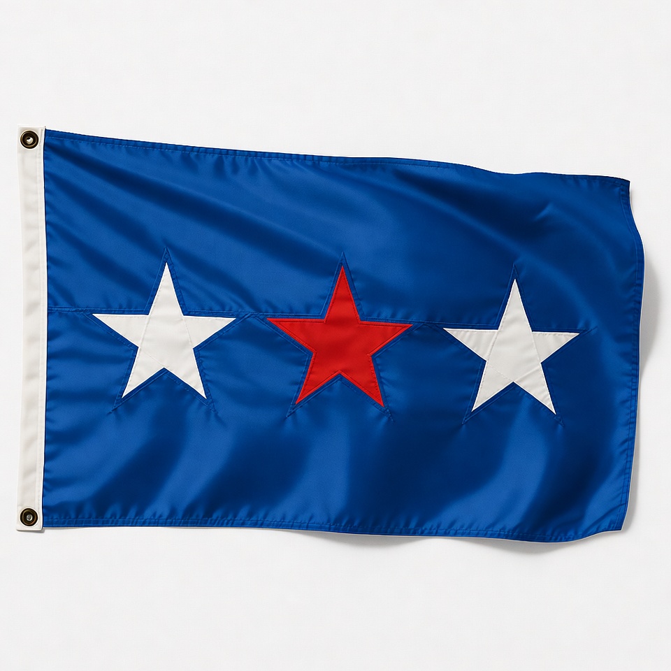 A flag displays three stars in a row. The center star is red, and the two outer stars are white. The background is a solid blue.