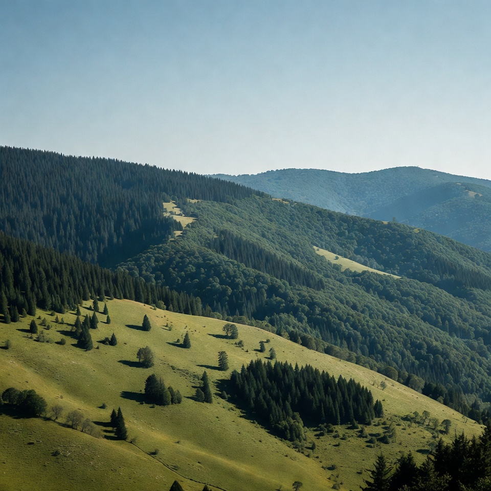 Green hills with scattered trees stretch across the landscape under a clear sky during the day. Distant mountains provide a backdrop.