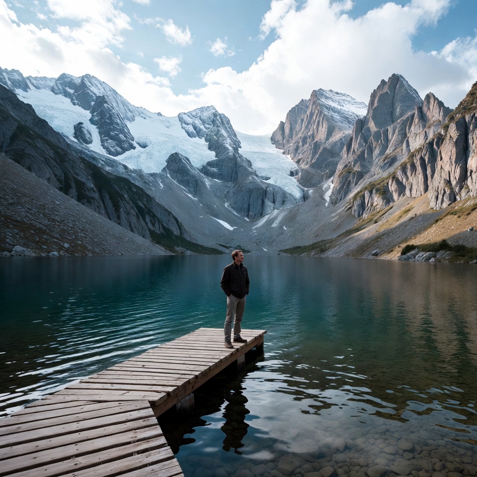 A man stands on a wooden dock by a clear lake surrounded by high mountains and snow. Clouds fill the sky above.