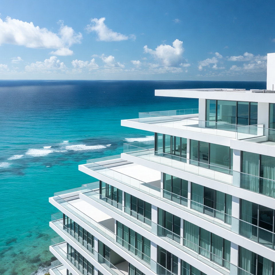 A tall building stands by the ocean, showcasing multiple balconies. Waves crash on the shore below. The sky has fluffy clouds.