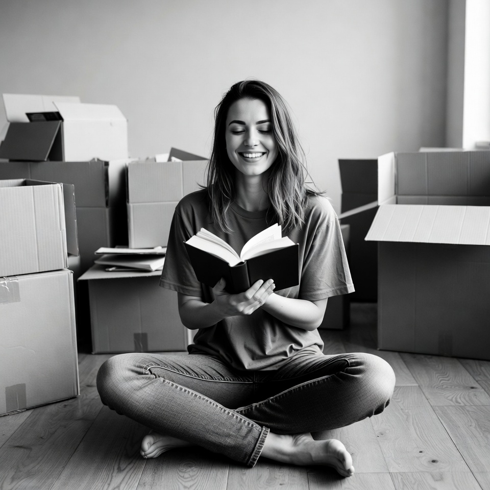 A woman sits on the floor surrounded by boxes. She smiles while reading a book during her moving day.