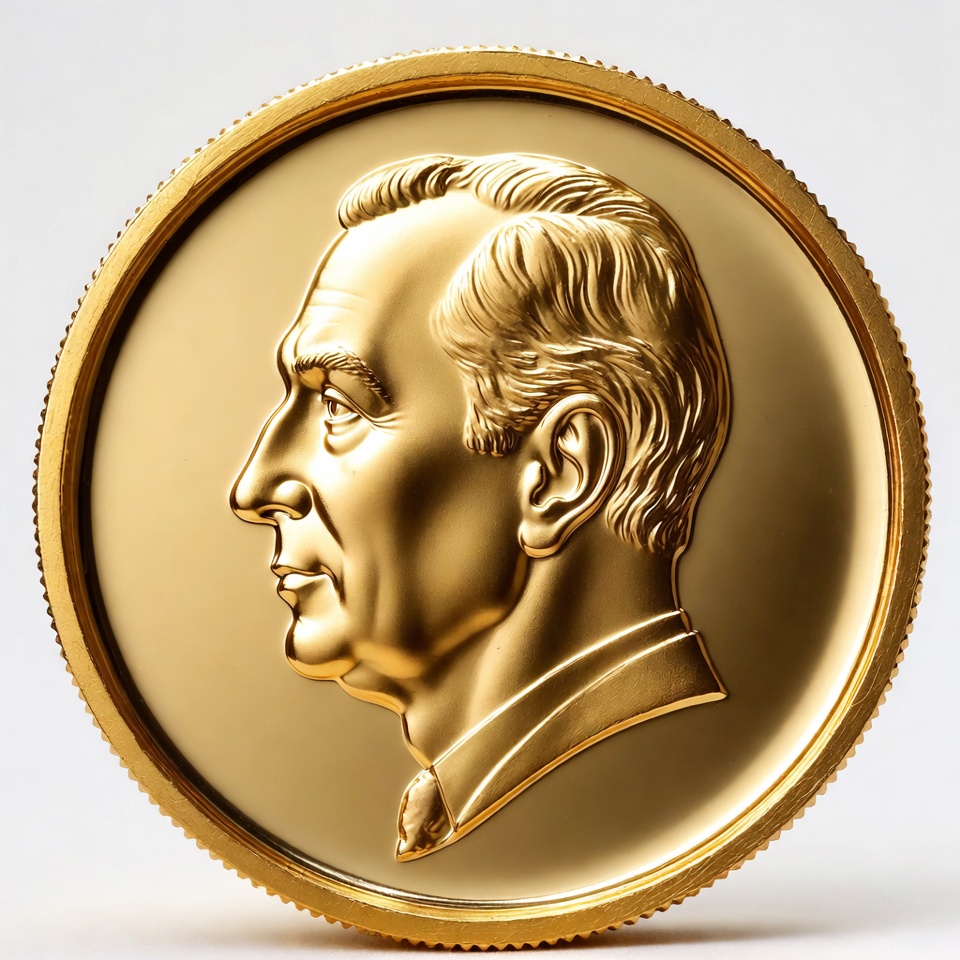 A close view of a gold coin shows the profile of a man. The coin shines bright under light, highlighting the detailed engraving.