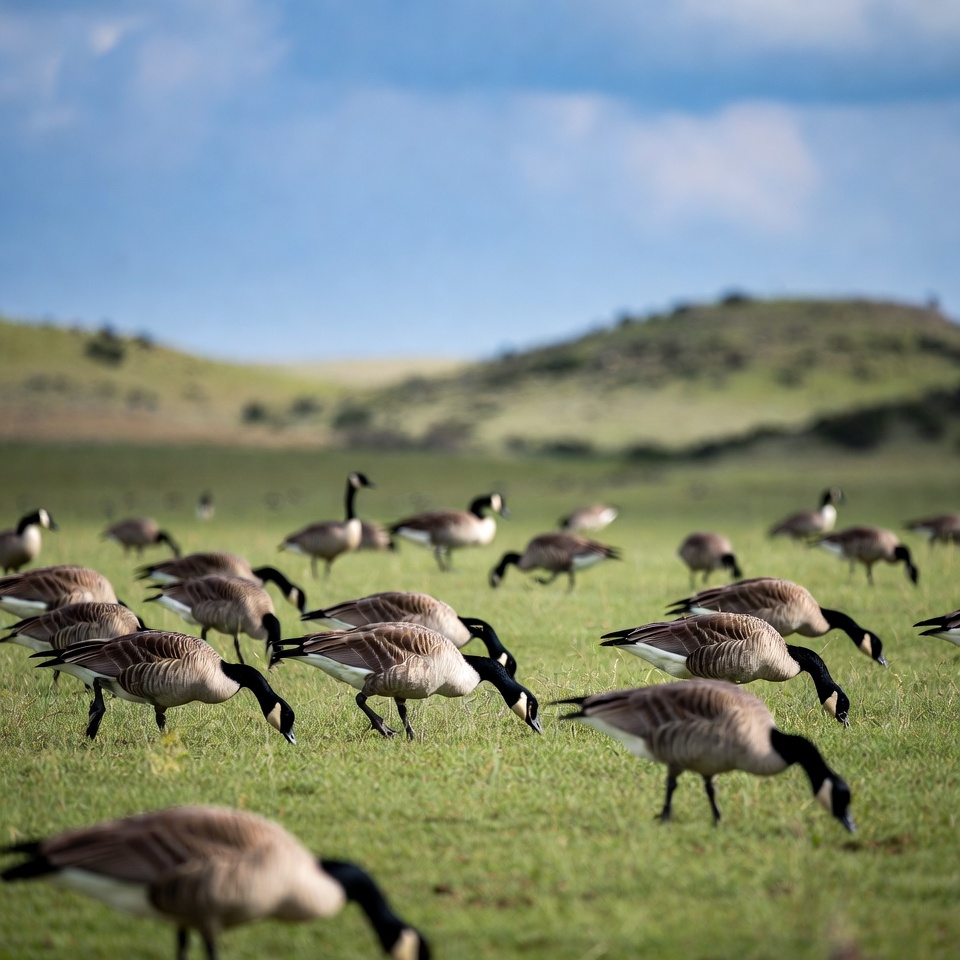animals, birds, clouds, feeding, field, flock, foraging, geese, grass, grassland, green, habitat, hills, landscape, migration, nature, outdoor, pasture, scenery, wildlife